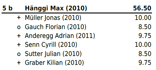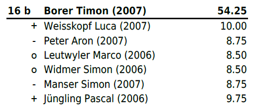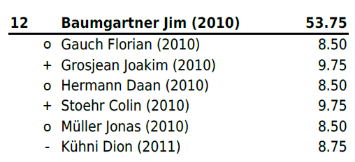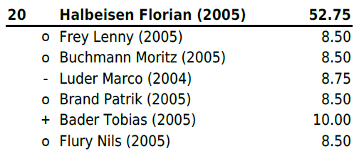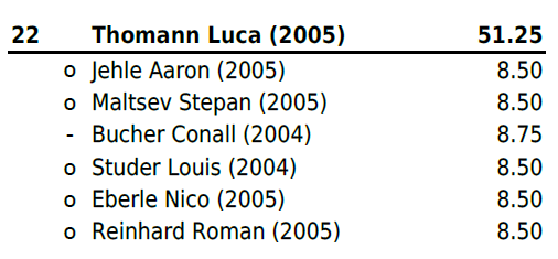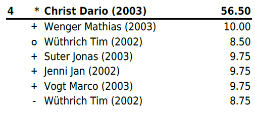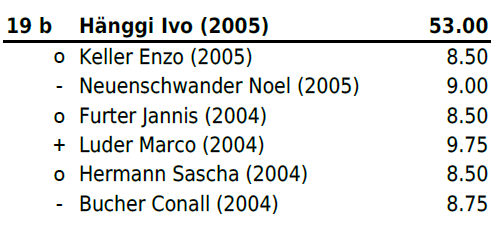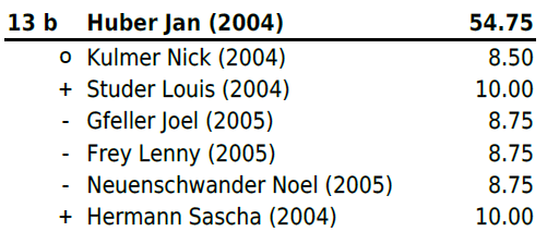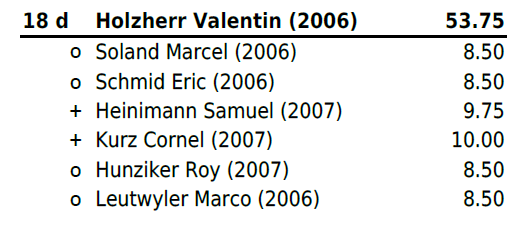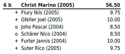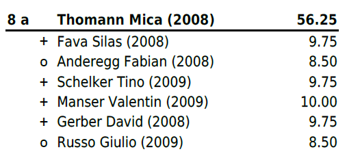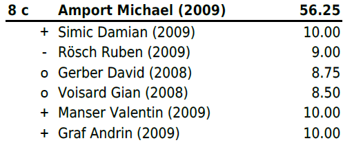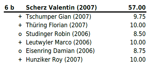 Jahrgang 2004-2005: Mit Zwei Niederlagen und vier gewonnen Gängen (zweimal Maximalnote) platzierte sich Christ Marino auf Rang 6b und erschwang sich somit einen weiteren Zweig. Für Huber Jan reichte es leider nach einer Niederlage und einem Sieg (mit Maximalnote) in Gang drei bis fünf nicht mehr zu einem Resultat und er stellte all diese Gänge. Trotz Sieg im letzten Gang reichte es ihm auf Platz 13b. Für Hänggi Ivo (Rang 19b), Halbeisen Florian (Rang 20) und Thomann Luca (Rang 22) reichte es leider am heutigen Tag nicht.